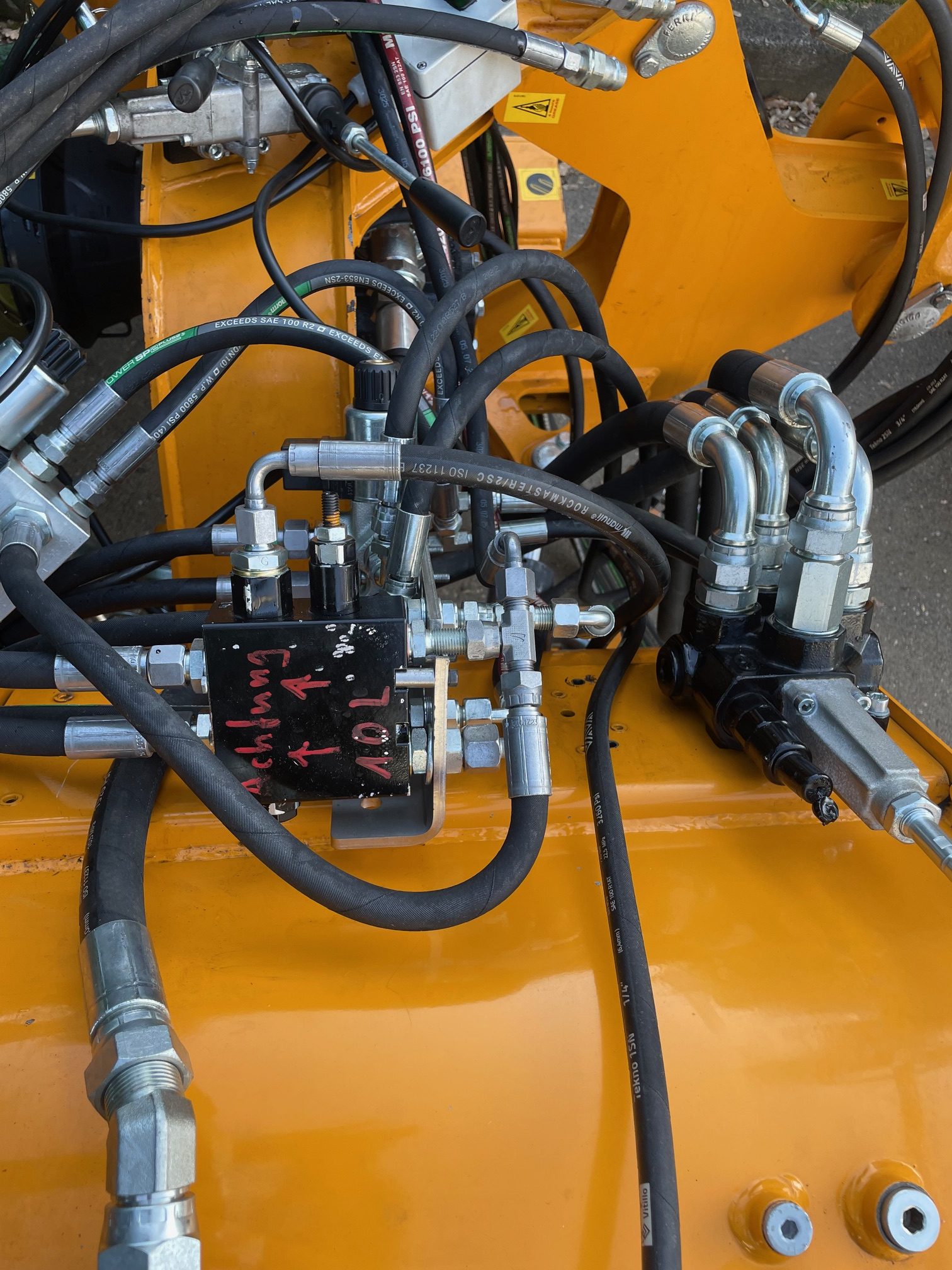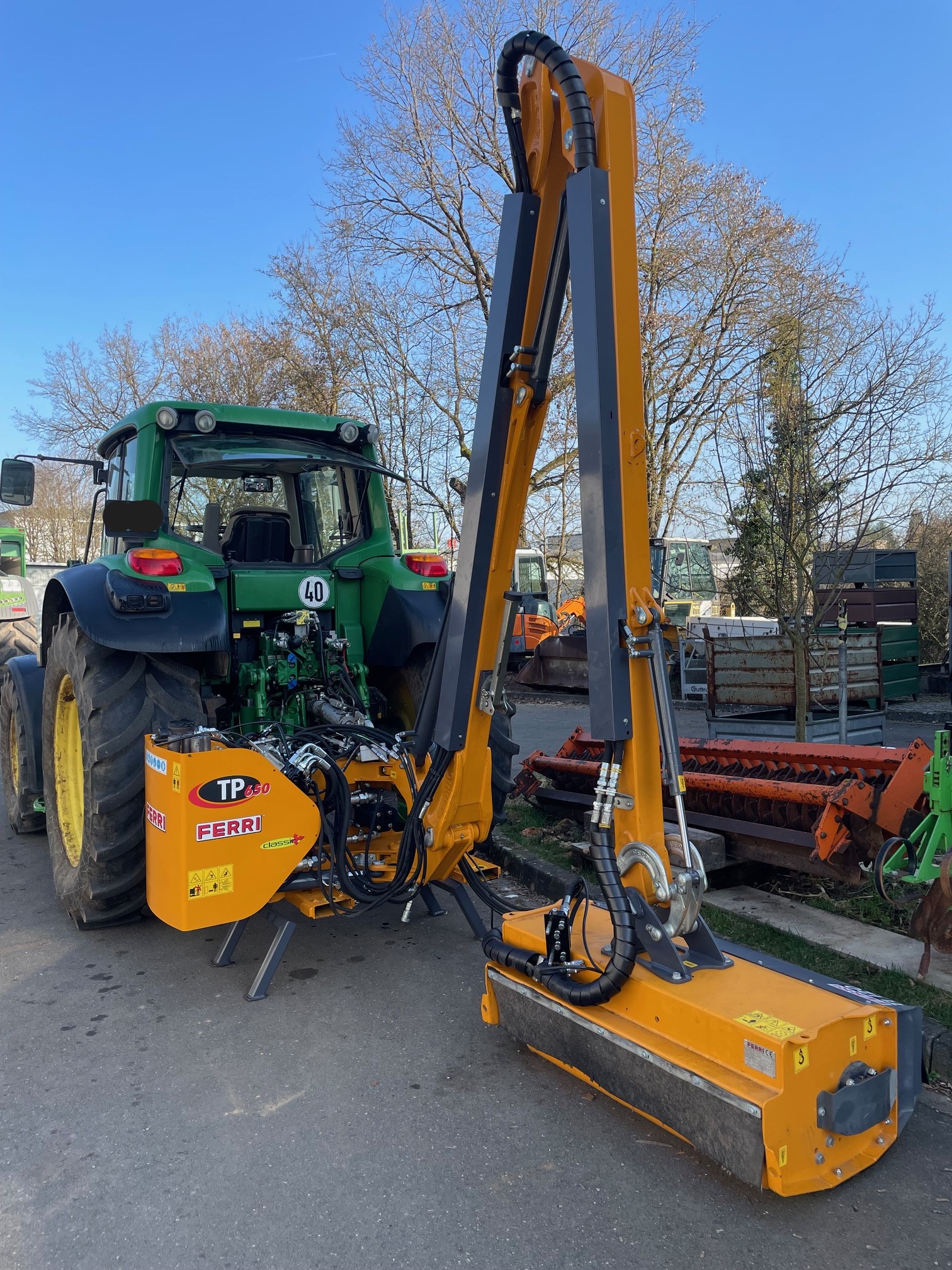 Das Produktportfolio von Ferri umfasst vom günstigen Einsteigermodell über Mittelklasse Auslegern bis hin zu hochprofessionellen Auslegern. Aktuell wurde ein Mittelklasse Ausleger an einem John Deere 6330 durch die Fa. Hetzel Technik angepasst. Der Ausleger, welcher auch mit eigener Proportionalsteuerung lieferbar wäre, wurde mit Bowdenzug-Steuerung geliefert. Diese Steuerung wurde teilweise abgebaut und an die schleppereigene Proportionalsteuerung über das Frontlader Ventil angebunden. Die Arbeitshydraulik des Werkzeuges (Mulcher, Säge oder Schere) wird weiterhin von der maschineneigenen Hydraulikanlage angetrieben, welche wiederum über eine Gelenkwelle vom Schlepper angetrieben wird. Die Steuerung der einzelnen Funktionen wird über den elektronischen Proportionalventilen des Schleppers realisiert. Die Abstützung des Auslegers über 2 Lenker lässt sich schnell und einfach in den Schlitten der Anhängekupplung einschieben.